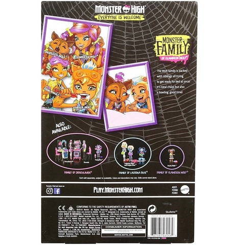 Очаровательное семейство монстров оборотней Вульф состоит из старшей сестры Клодин, младшего брата волчонка Бейкера и малютки Вередит. Клодин предстоит позаботиться о своих родных волчатах. Куклы не шарнирные с молдированными элементами шерсти.