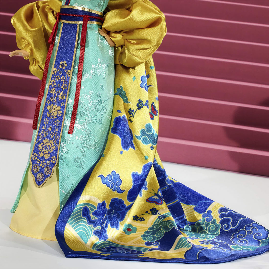 Отважная Мулан покоряет мир высокой моды в коллекции «Зачарованная элегантность». Вдохновленная одноименным фильмом, кукла премиум-класса поражает воображение в эффектном платье с плиссированным воротником. Ее атласное жаккардовое платье украшено цветочным мотивом, а пышная накидка декорирована сюжетным рисунком. Головной убор из цветов и ветвей венчает прическу-пучок, распущенный веером набок. Она станет великолепным дополнением к любой коллекции.