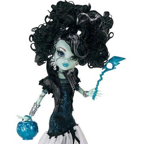 Френки – дочь Франкиштейна. Эта милашка была собрана из подручного материала, поэтому её глаза разного цвета. Куколка имеет бледно - зеленоватый оттенок кожи, длинные черные волосы с белыми прядками, собранные в кудрявый, пышный хвост. На щечках героине красуются шов и молния, пухлые губки подчеркивает голубая помада. Монстряшка одета в черно - синее платье с полупрозрачной юбкой с серебристыми узорами в виде болтов и электрических разрядов. Поверх платья одето болеро. Ушки героини украшают серебряные серьги, напоминающие гайки, которые перекликаются с браслетами и ожерельем в этом же стиле. В руках у малышки маска и горшочек для сладостей лазурного оттенка. На ножках Френки синие бриджи и высокие черные ботфорты на платформе. Дополнительно в комплекте идет подставка, расческа, телефончик - айгроб и металлический чан с колдовским зельем.