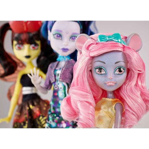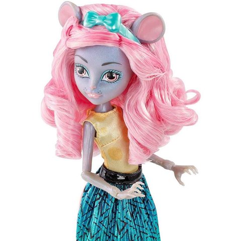 Мауседес имеет серый скинтон, розовые глазки и губки с белыми мышиными зубками. Розовые волосы распущены и завиты в шикарные локоны. На голове есть серый ушки и бирюзовый ободок с батиком. К спине прикреплен розовый крысиный хвостик. Одела малышка золотой топ и гофрированную юбку аквамаринового оттенка с ромбическим принтом. На ножках коралловые босоножки с переплетениями.