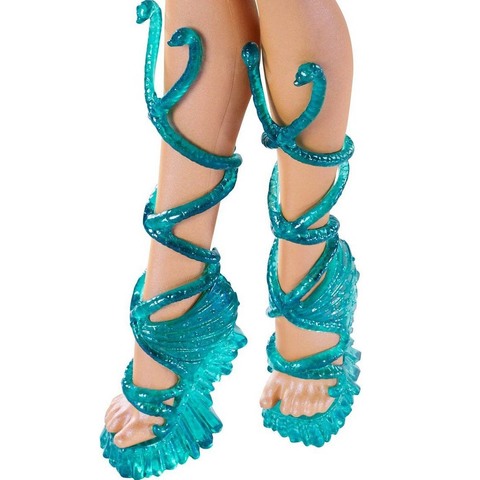 Героиня одета в сапфировое платье с абстрактным рисунком цвета морской волны. Платье украшает эффектный золотой корсет с кристаллическим эполетом слева. В руках монстряшки сиреневый осколок кометы. Обута дочь мумии в бирюзовые босоножки с переплетенными змеями на хрустальной платформе.