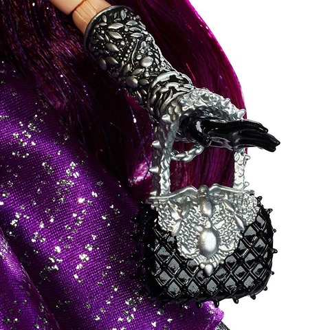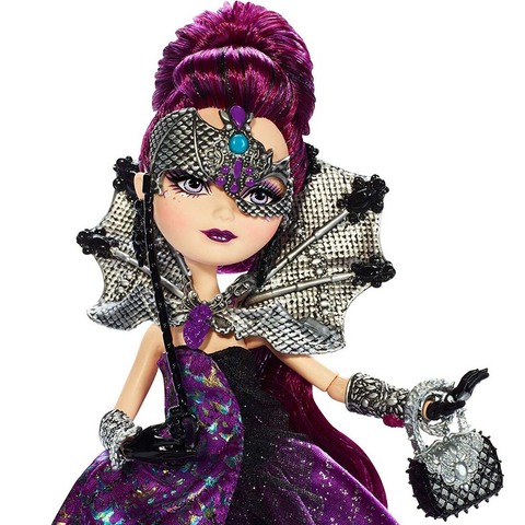 Рейвен Квин – отступница в школе для детей сказочных героев. Девушка идет на бал и желает стать победительницей. Ее темные волосы с фиолетовыми прядками собраны в высокую прическу. Личико с восхитительной ровной кожей она прячет за серебристой маской, в виде летучей мыши, которую придерживает правой рукой. Ассиметричную маску украшает огромный аметист. На ней – дизайнерское платье. Фиолетовая блестящая ткань и черная органза в качестве оборки окутали ее стройную фигурку сверху и до пят. Бюст обтягивает парча черного цвета. Вокруг тонкой шеи – высокий воротник из металлических нитей с застежкой в виде жука скарабея, панцирь и голова которого украшены двумя большими аметистовыми камнями. Кисти облегают черные перчатки и широкие серебряные браслеты. На левой ручке – темная миниатюрная сумочка с серебристой шипованной ручкой. Ножки обуты в фиолетовые босоножки с серебристыми пряжками.